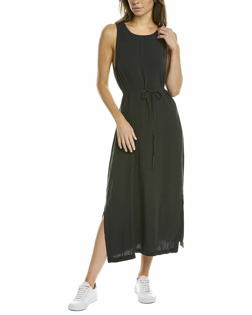 - Zinnia Linen-Blend Dress In Lead With Removable Waist Tie, Ribbed Side Panels, And Side Slits At Hem